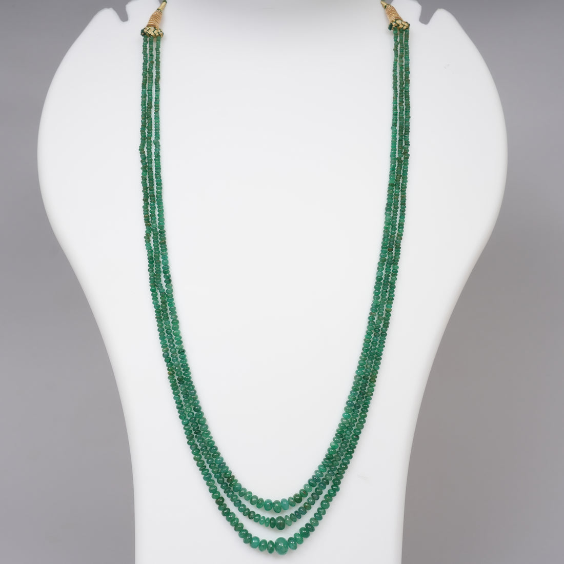 Lush and vibrant, this 3-strand necklace features Natural Zambian Emerald smooth beads in varying sizes...
