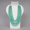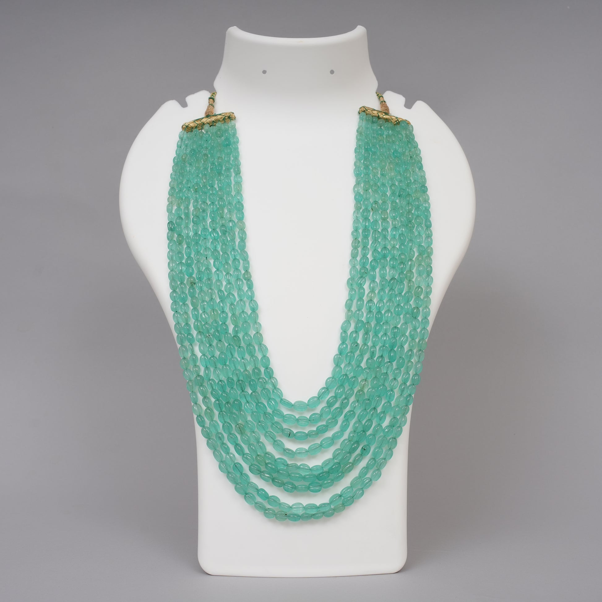 Delicate and detailed, this stunning necklace showcases hand-carved Green Beryl ovals in a refreshing light green hue. With 8 beautifully layered strands, it’s a graceful statement of artistry and elegance.