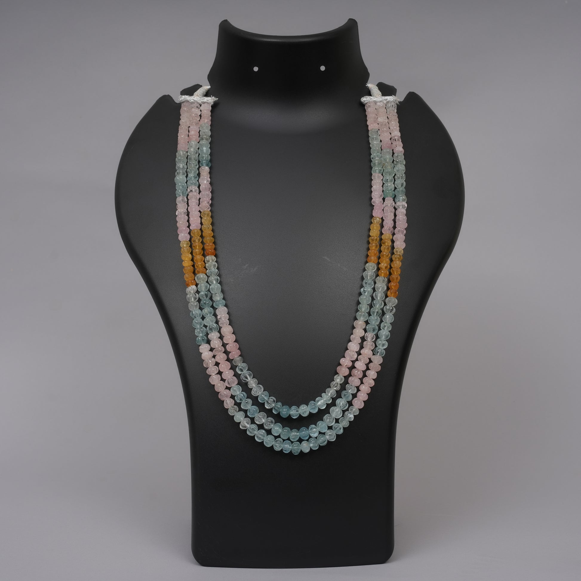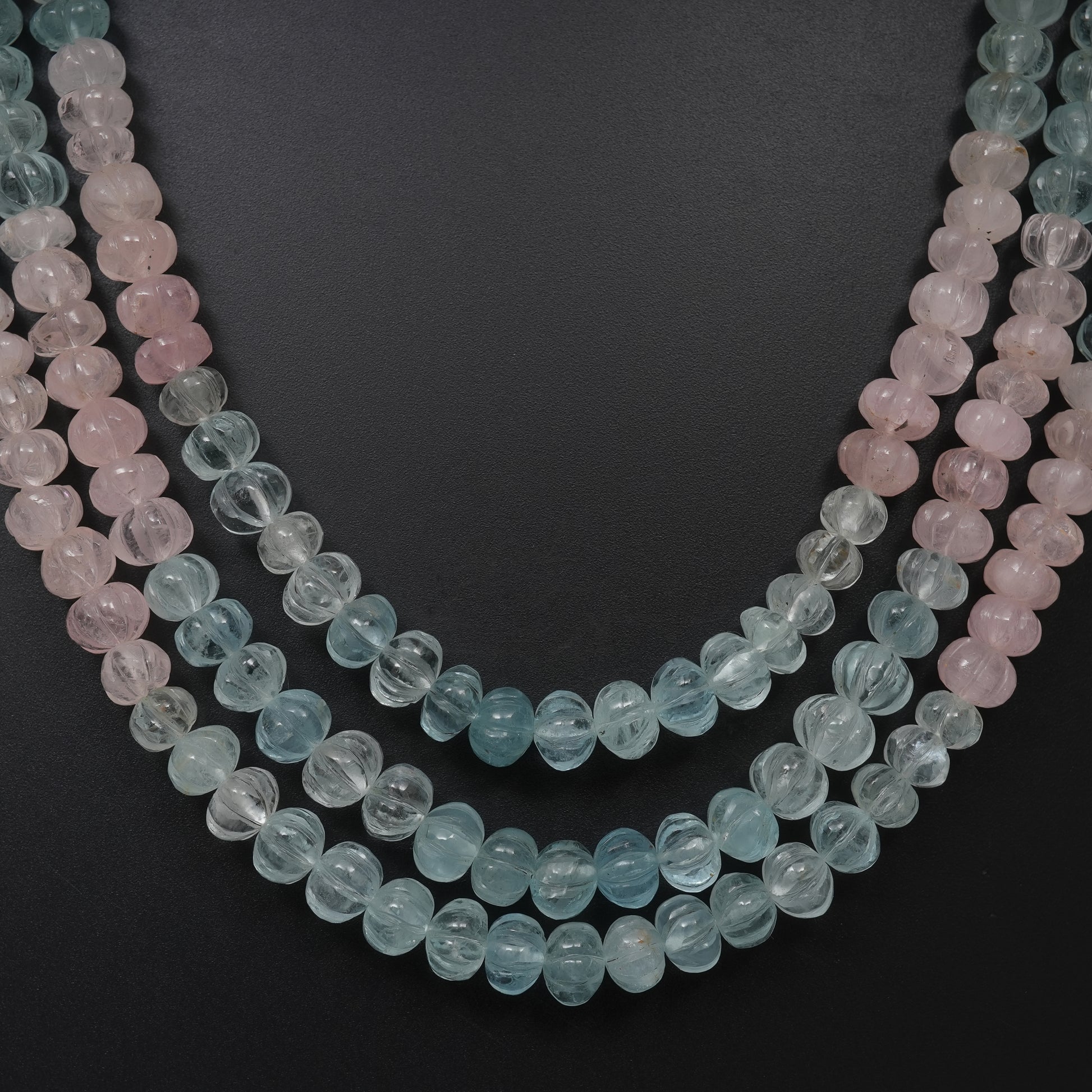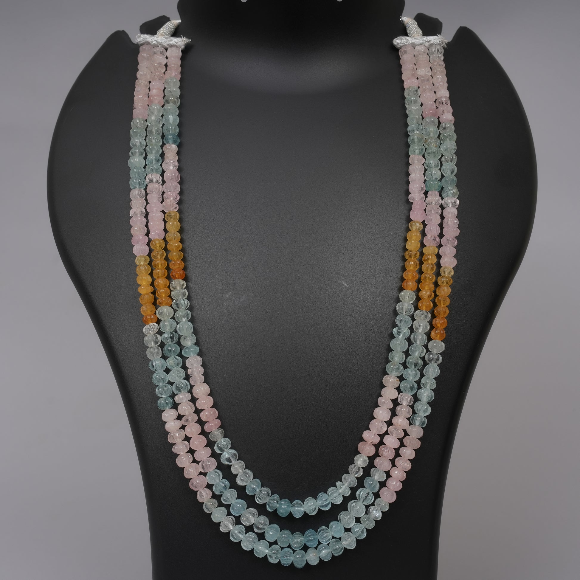 Elevate your look with the refreshing tones of Multi Aquamarine in this intricately crafted melon-cut necklace. Each bead showcases delicate hand carving, creating a natural rhythm and texture across the strands.