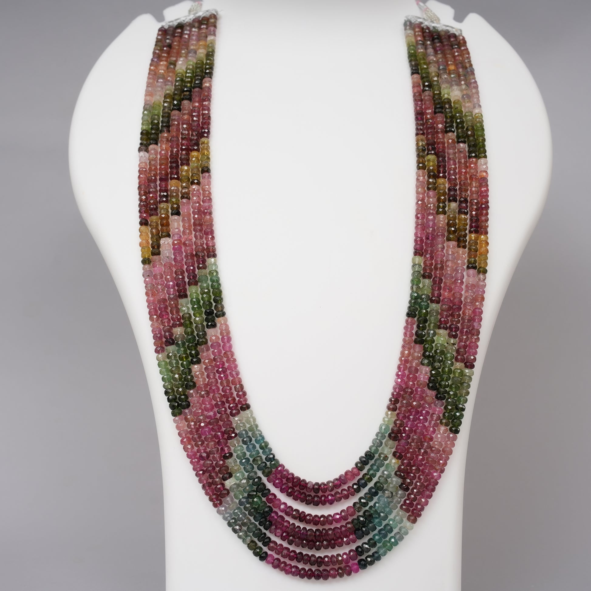 Colorful, captivating, and full of natural charm, this 7-strand necklace features a brilliant mix of Multi Tourmaline faceted beads, each radiating hues of pink, green, yellow, and more. With a uniform bead size of 5 mm (approx.), this 24-inch necklace sparkles with energy and elegance across every layer.