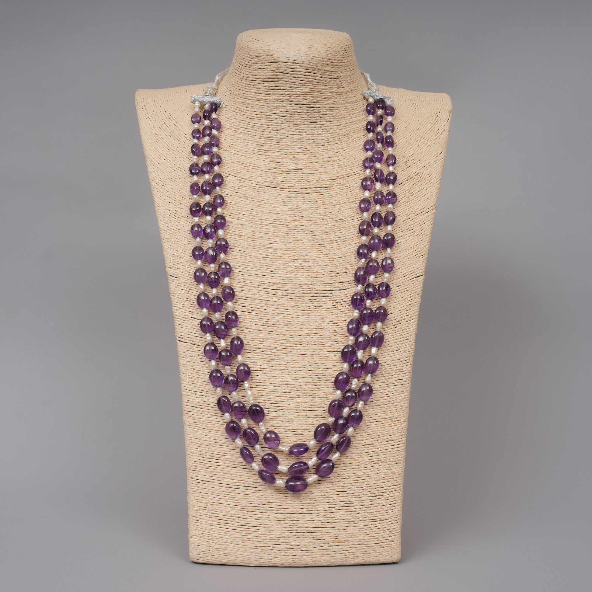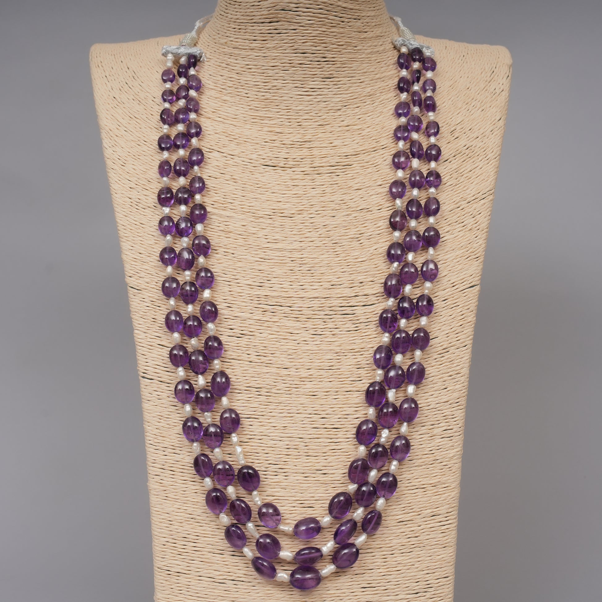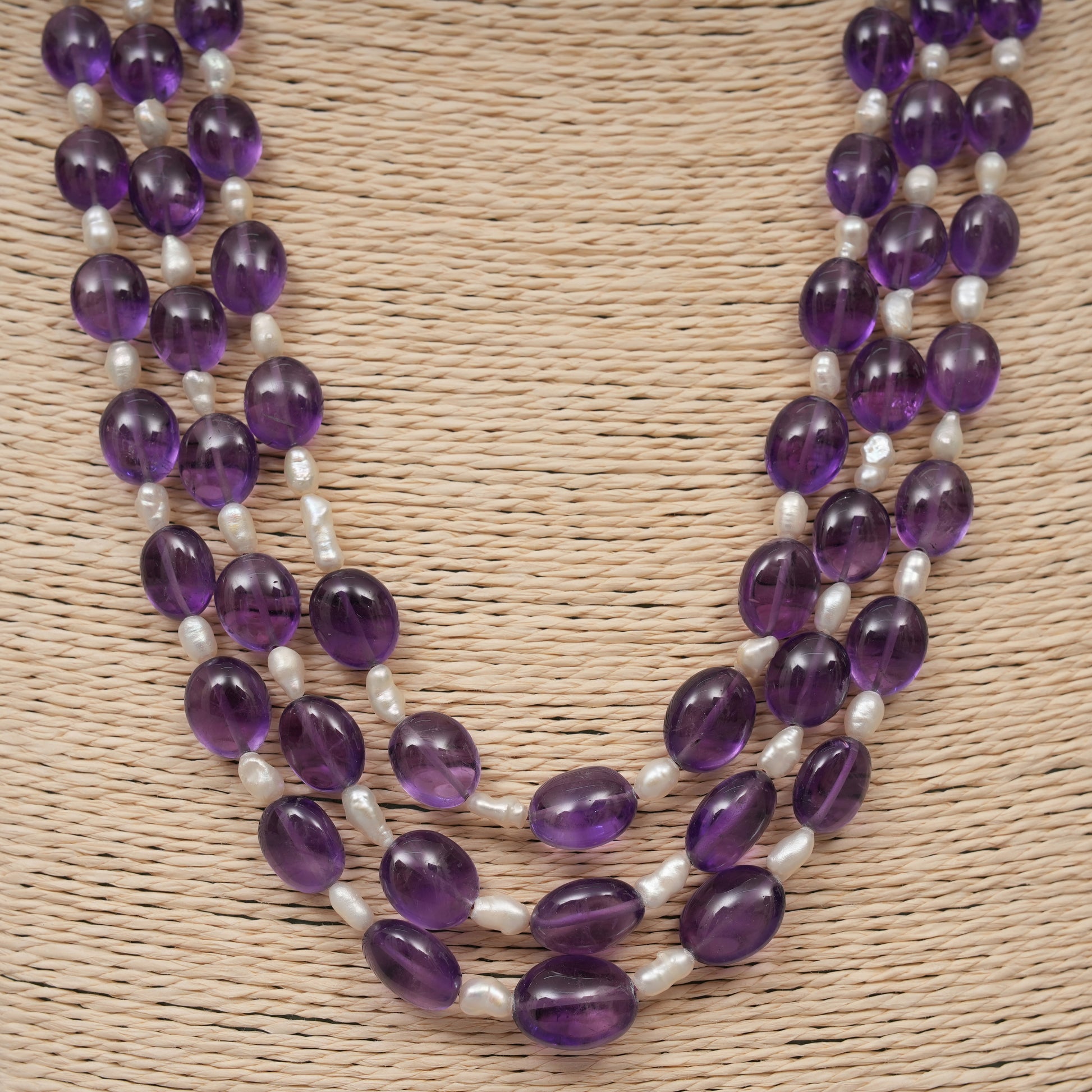 A regal combination of rich purple Amethyst ovals and elegant pearls, this 3-strand necklace blends sophistication with timeless charm. The smooth gemstones radiate a soft glow, beautifully complemented by the lustrous pearls.