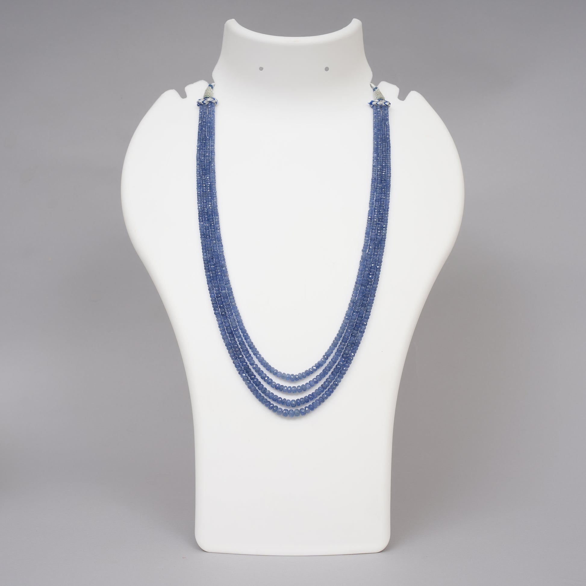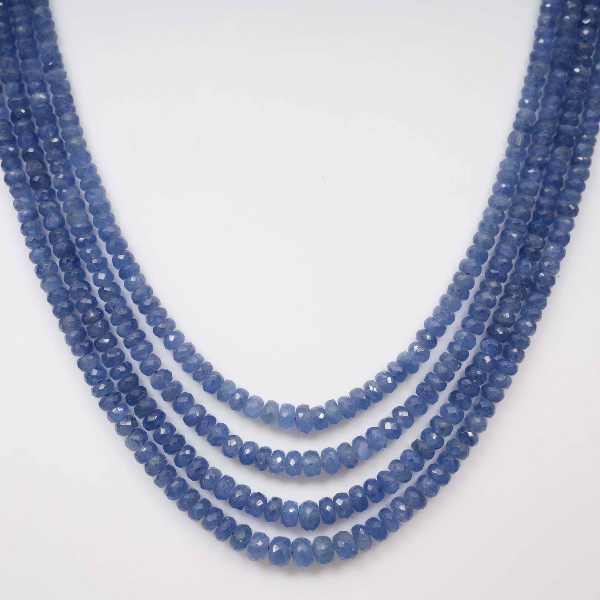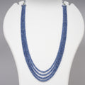 Sophisticated and luminous, this 4-strand necklace showcases stunning Natural Burma Blue Sapphire faceted beads, prized for their rich deep-blue hue and brilliance. Each bead, sized between 3–5 mm (approx.), is finely cut to reflect light beautifully, creating a striking yet elegant 21-inch piece.