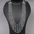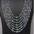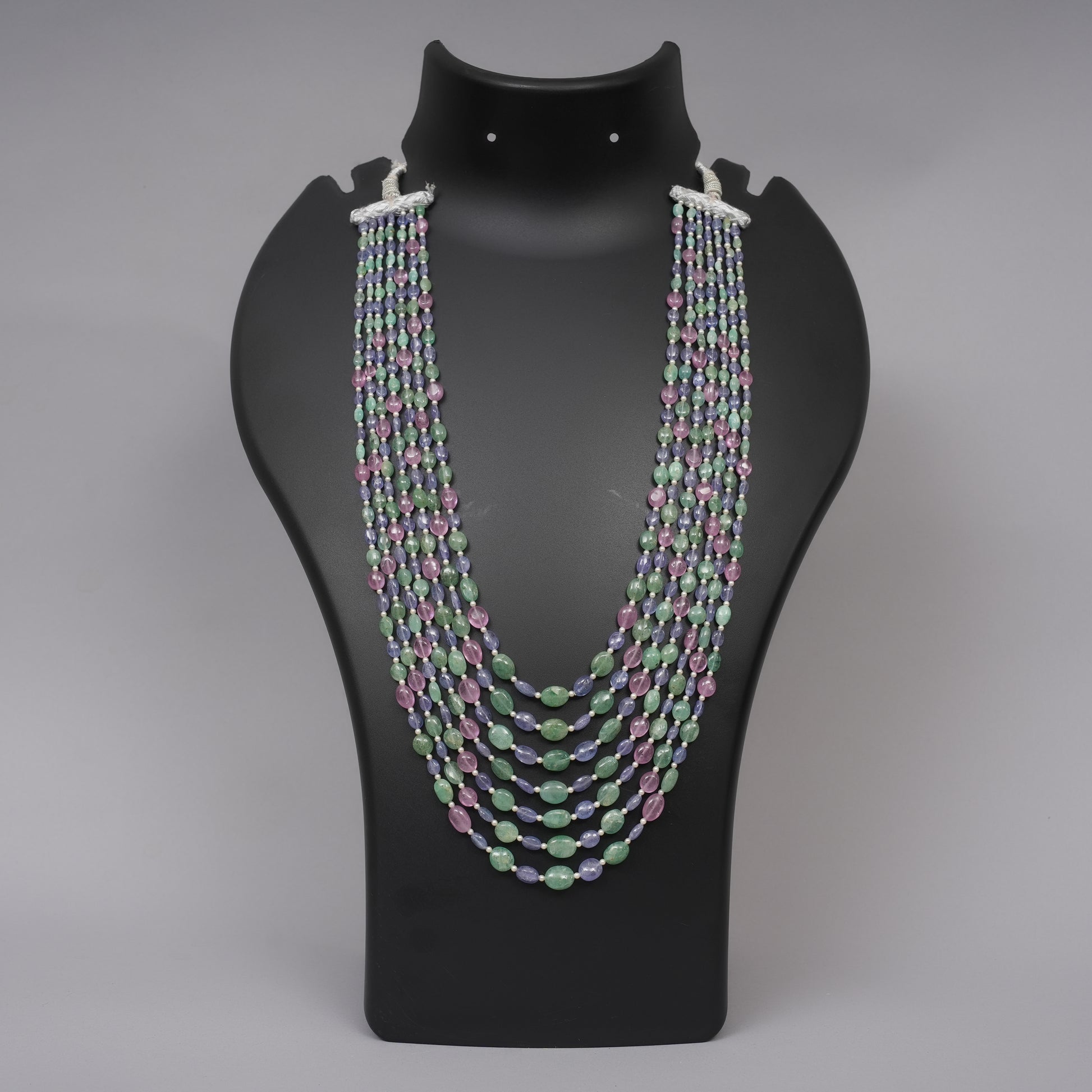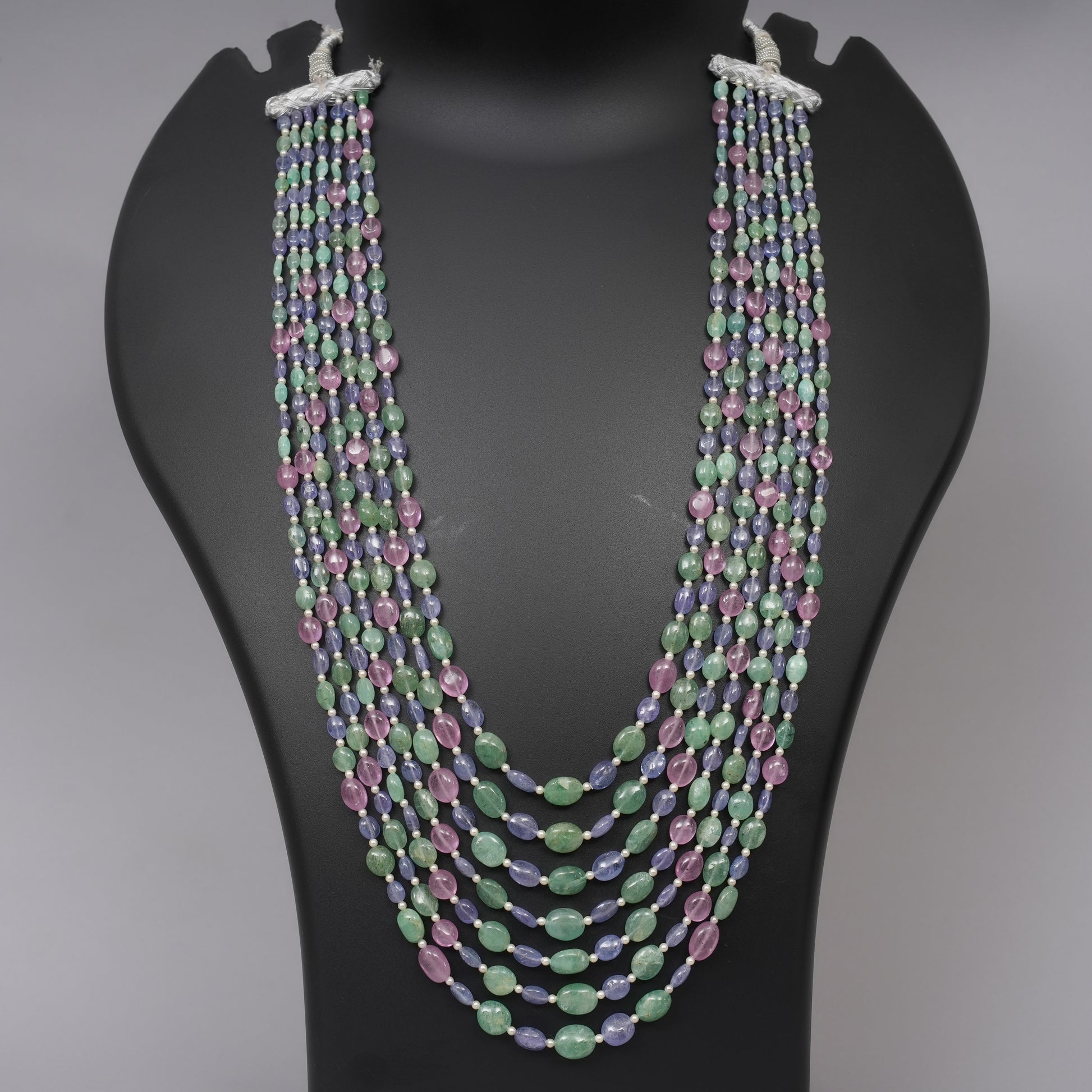 A rich symphony of regal hues, this 7-strand necklace blends the timeless elegance of Natural Emerald, Ruby, and Tanzanite smooth oval beads. With bead sizes ranging from 6x8 mm to 9x12 mm (approx.), each strand is expertly hand-strung to create a harmonious 23-inch design full of depth, color, and sophistication.