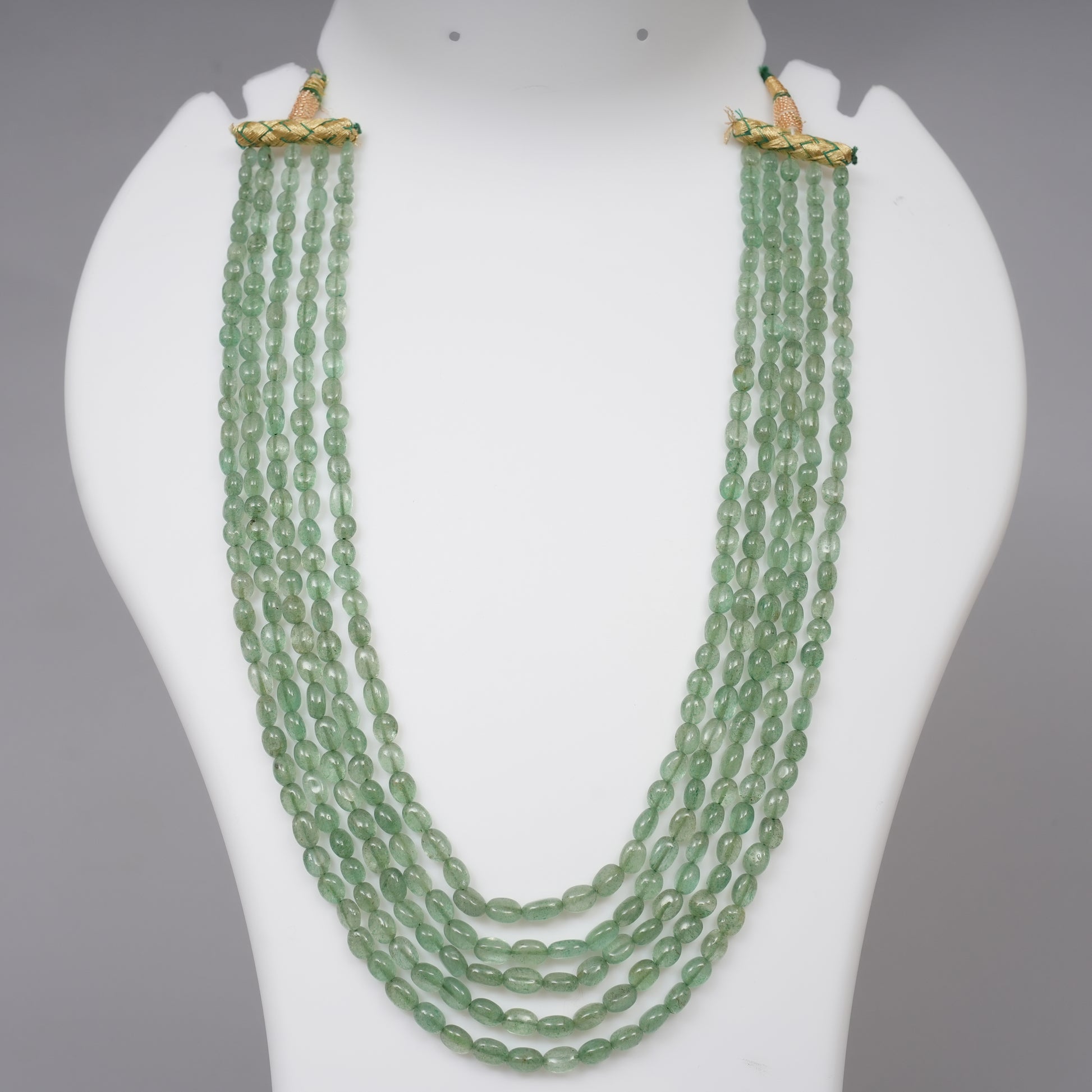 Add a splash of fresh elegance with this Natural Green Strawberry Quartz Necklace. Featuring smooth oval beads, this 5-strand piece reflects a soft, earthy green with subtle inclusions that give it a distinct character and charm.