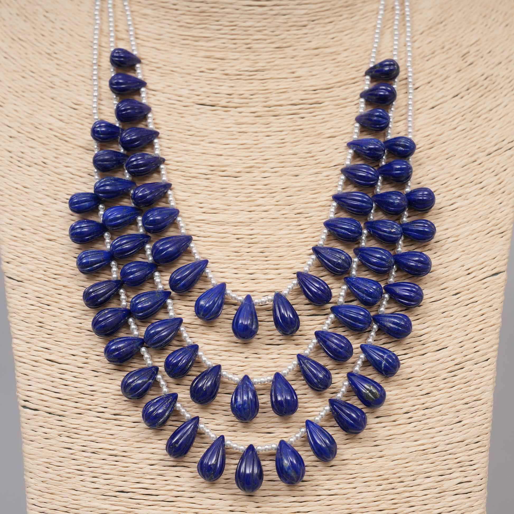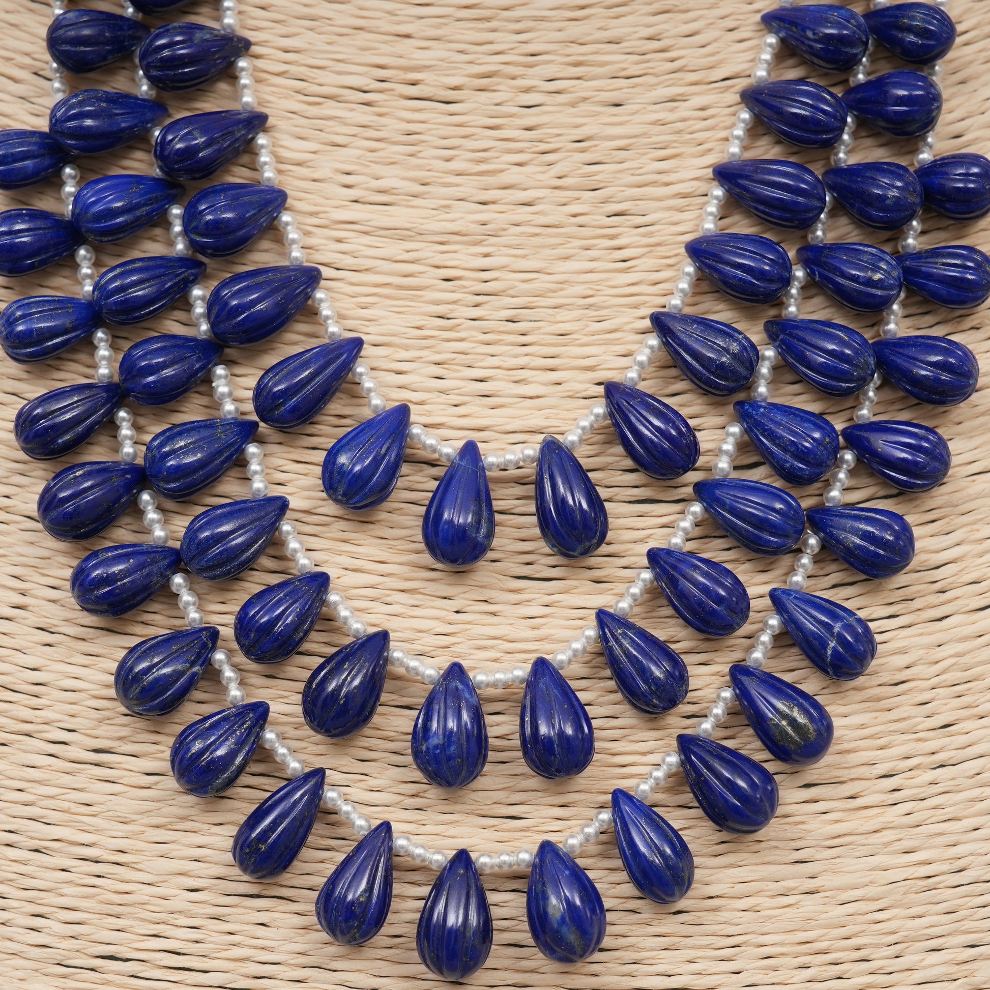 Discover timeless elegance with this Natural Lapis Lazuli Carved Drops with Pearls Necklace, an exquisite 3-strand design that blends the deep royal blue of lapis with the soft luster of natural pearls. The carved drop beads, sized approx. 7x13 mm to 9x15 mm, offer a regal touch with fine detailing.
