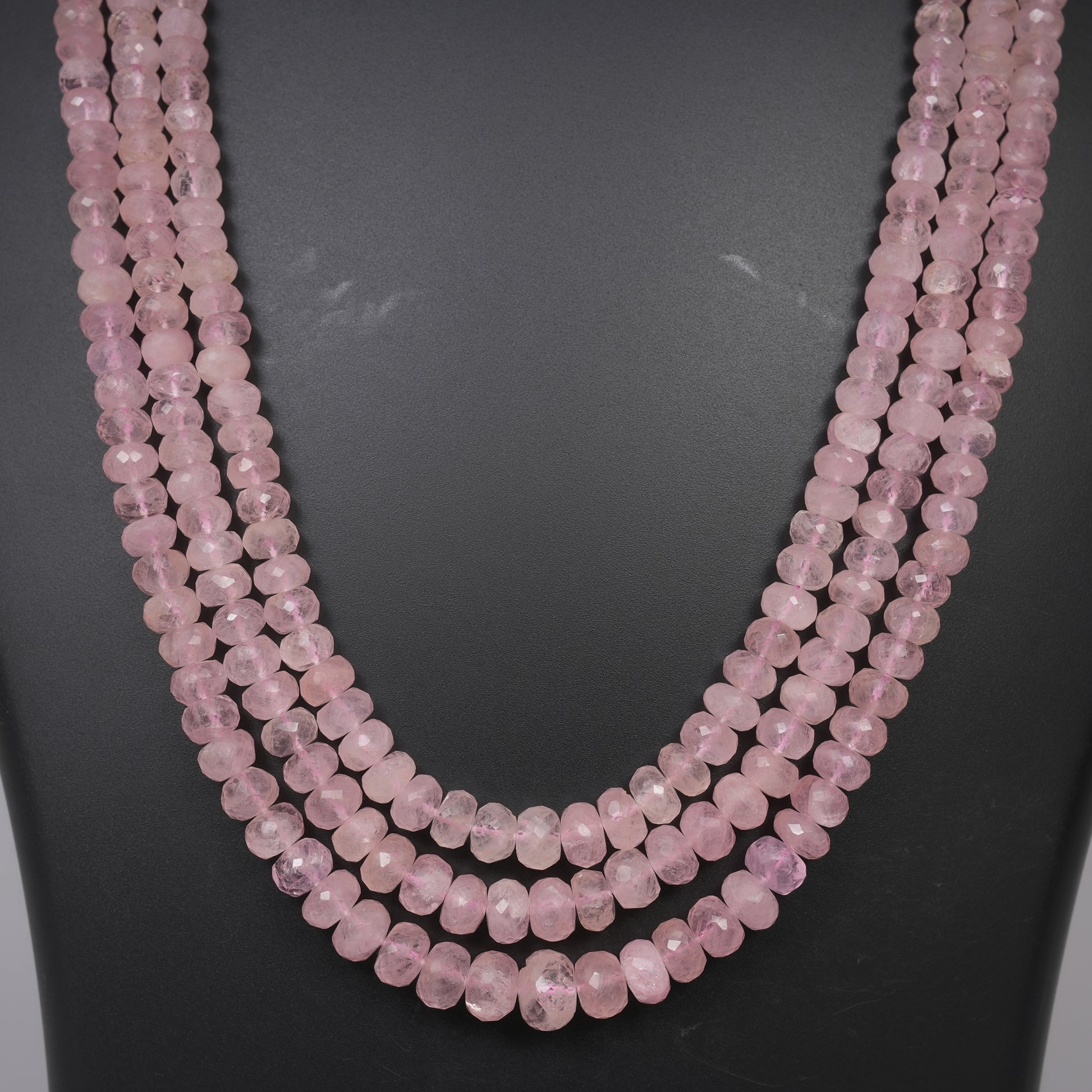 Radiating soft elegance, this Natural Morganite Faceted Beads Necklace is a beautiful blend of grace and sparkle. Featuring delicate 6–9 mm faceted beads, this handcrafted necklace is composed of 3 strands of gentle blush-pink tones that reflect light with every movement.