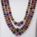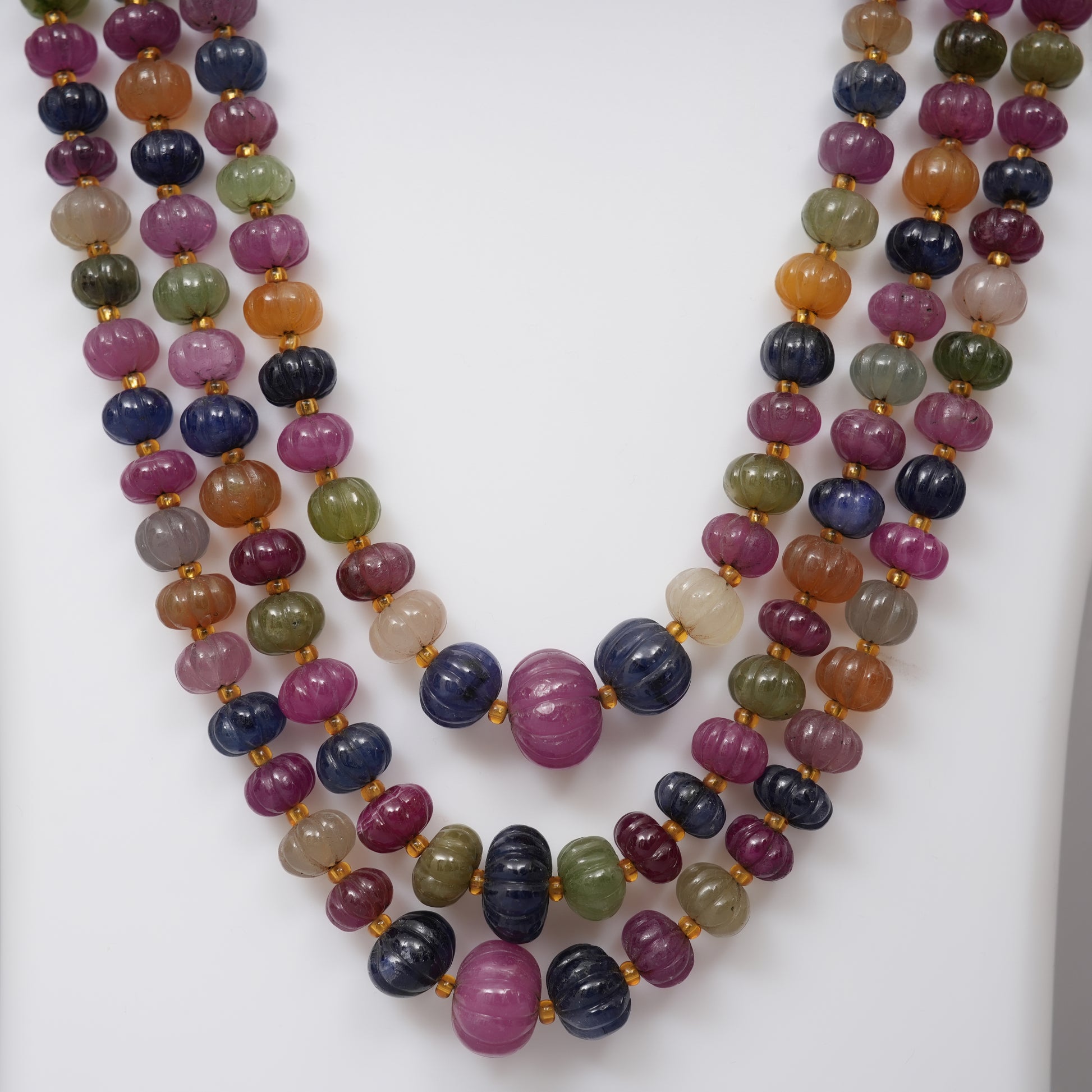 Bold, vibrant, and intricately detailed, this 3-strand necklace features exquisite Natural Multi Sapphire carved melon beads. Each bead—sized between 9 to 14 mm (approx.)—is hand-carved into a melon shape, showcasing a spectrum of rich sapphire hues. The 24-inch necklace is a celebration of craftsmanship and color, making it a standout statement piece.