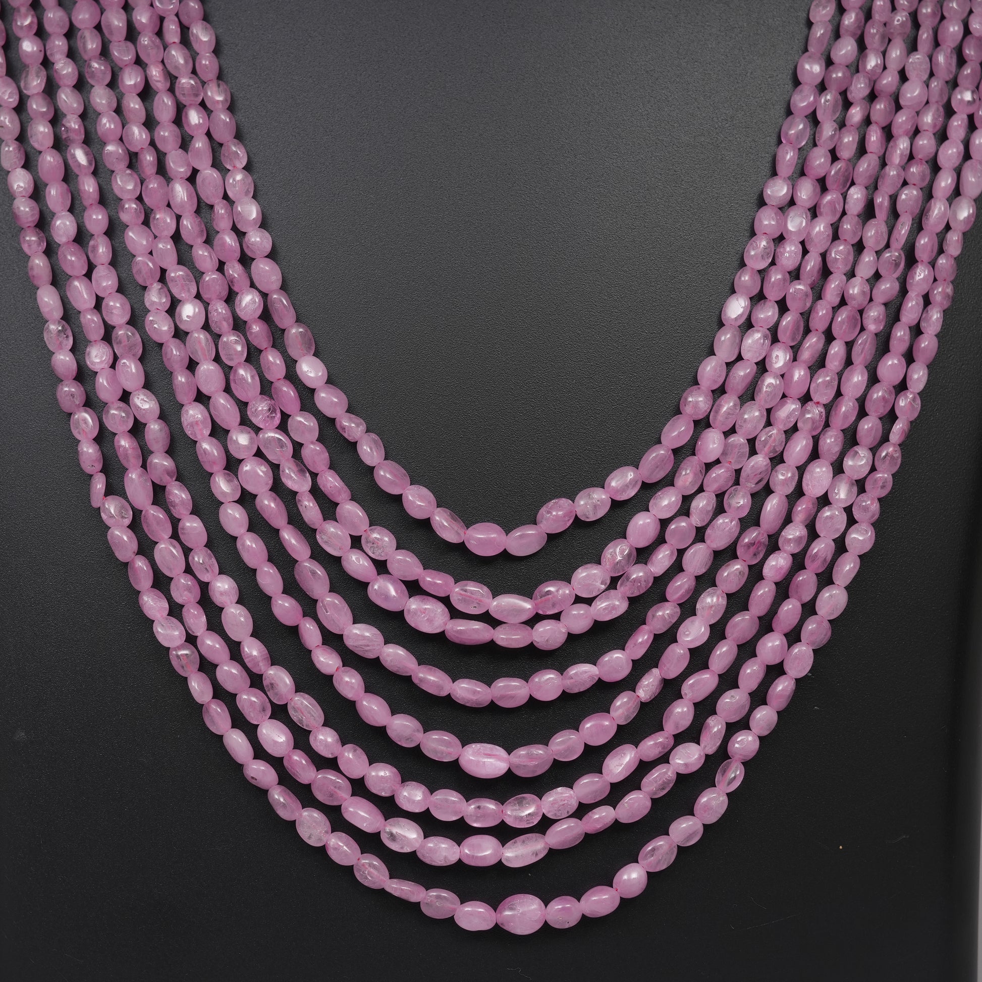 Elegant and feminine, this 8-strand necklace showcases radiant Natural Pink Sapphire smooth oval beads in delicate hues of rose and blush. With bead sizes ranging from 3x5 to 4x6 mm (approx.), this finely crafted 24-inch necklace exudes grace and sophistication.