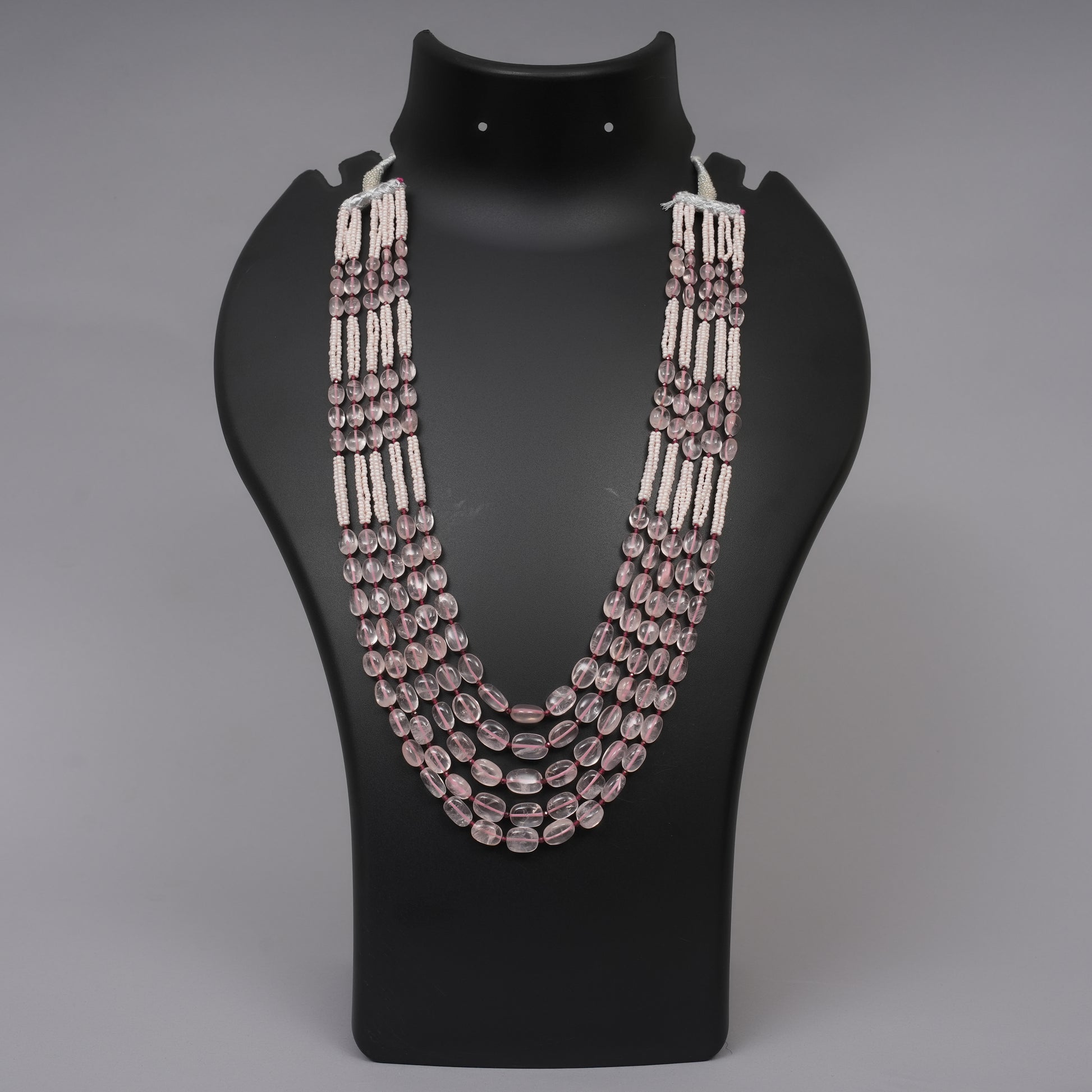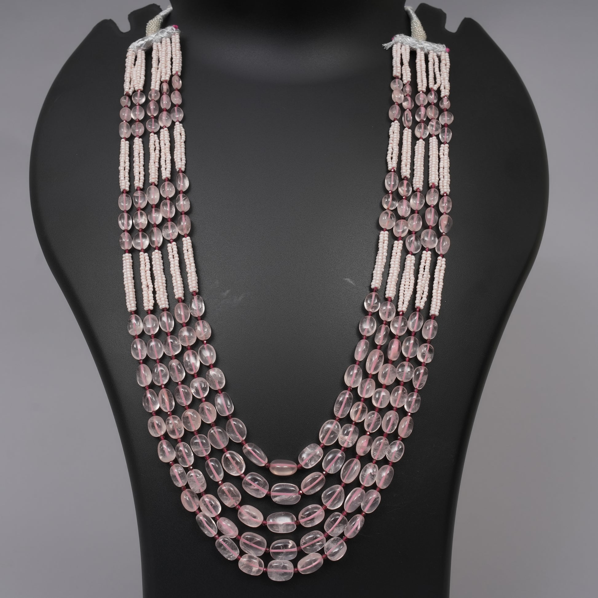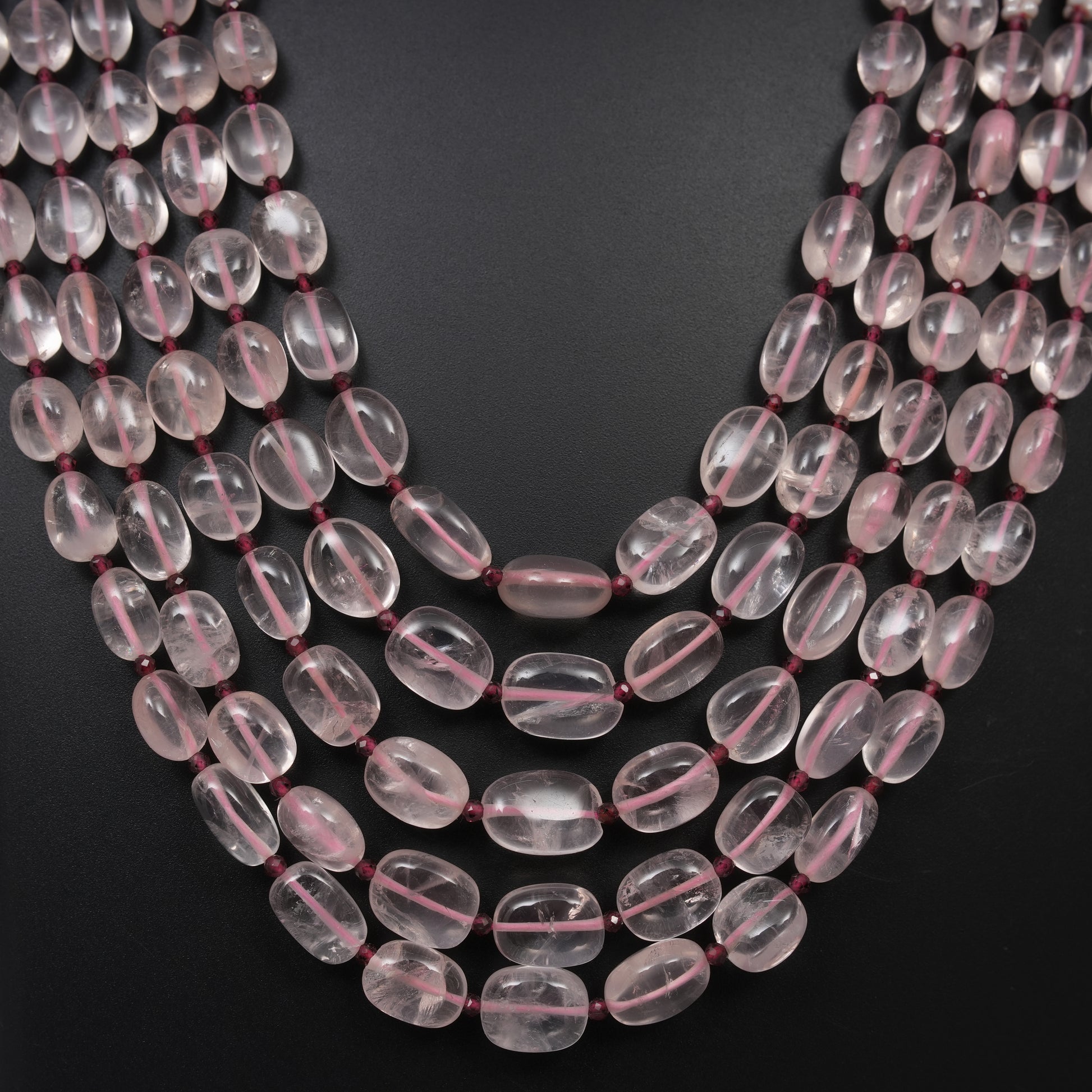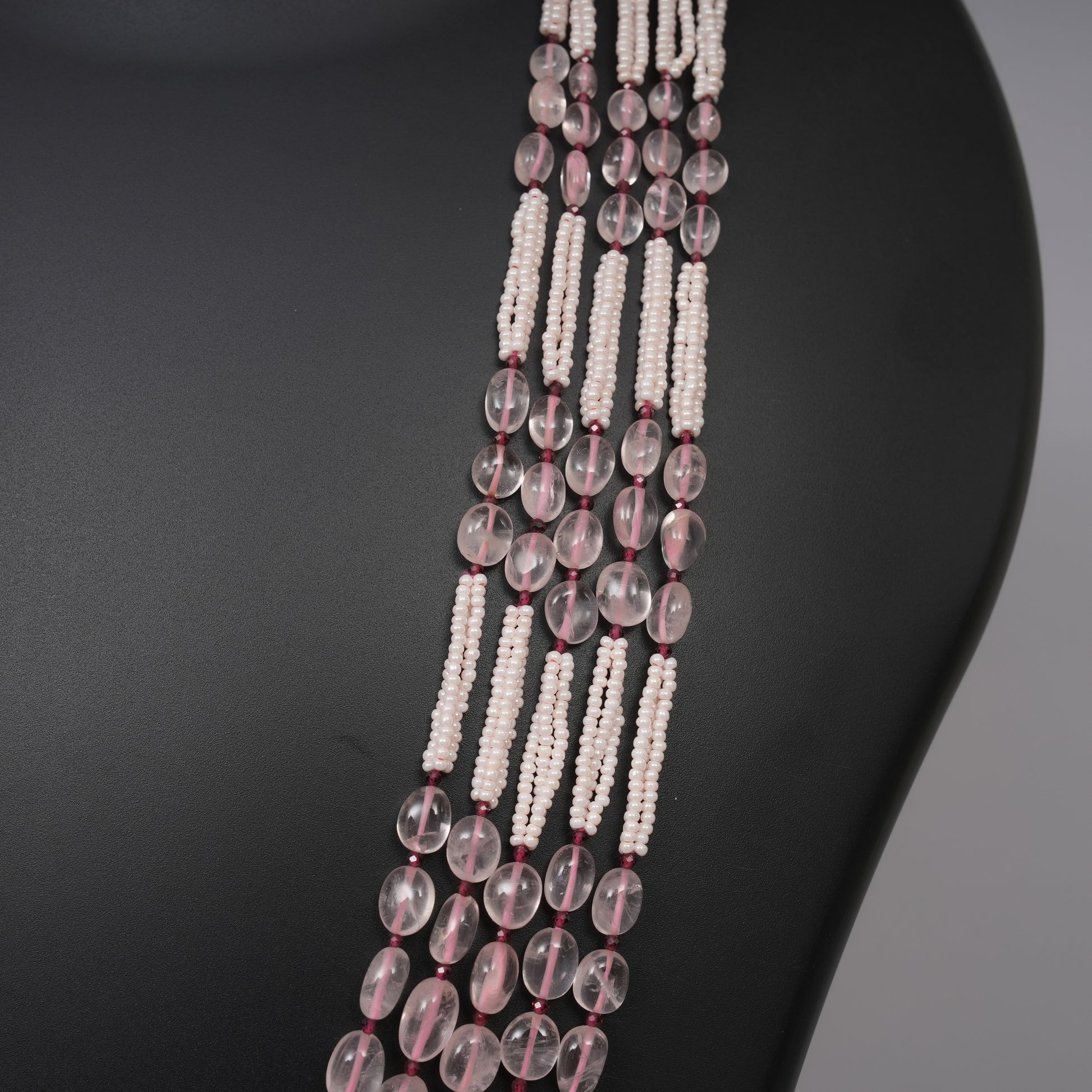 A graceful blend of soft elegance and timeless charm, this 5-strand necklace features Natural Rose Quartz smooth ovals, beautifully accented with deep Garnet beads and delicate pearls. The gentle pink hues of rose quartz paired with the richness of garnet and the sophistication of pearls make this piece effortlessly versatile.
