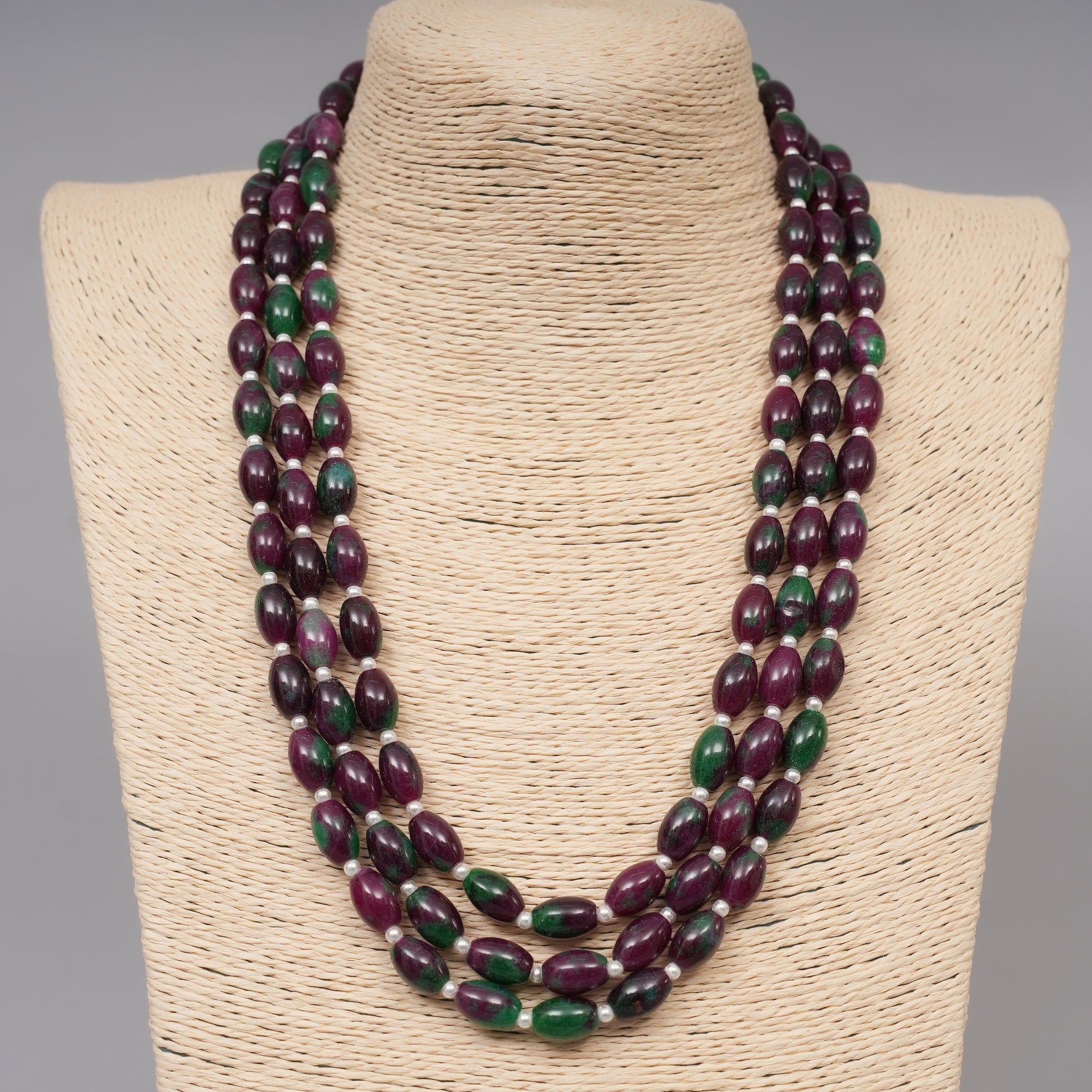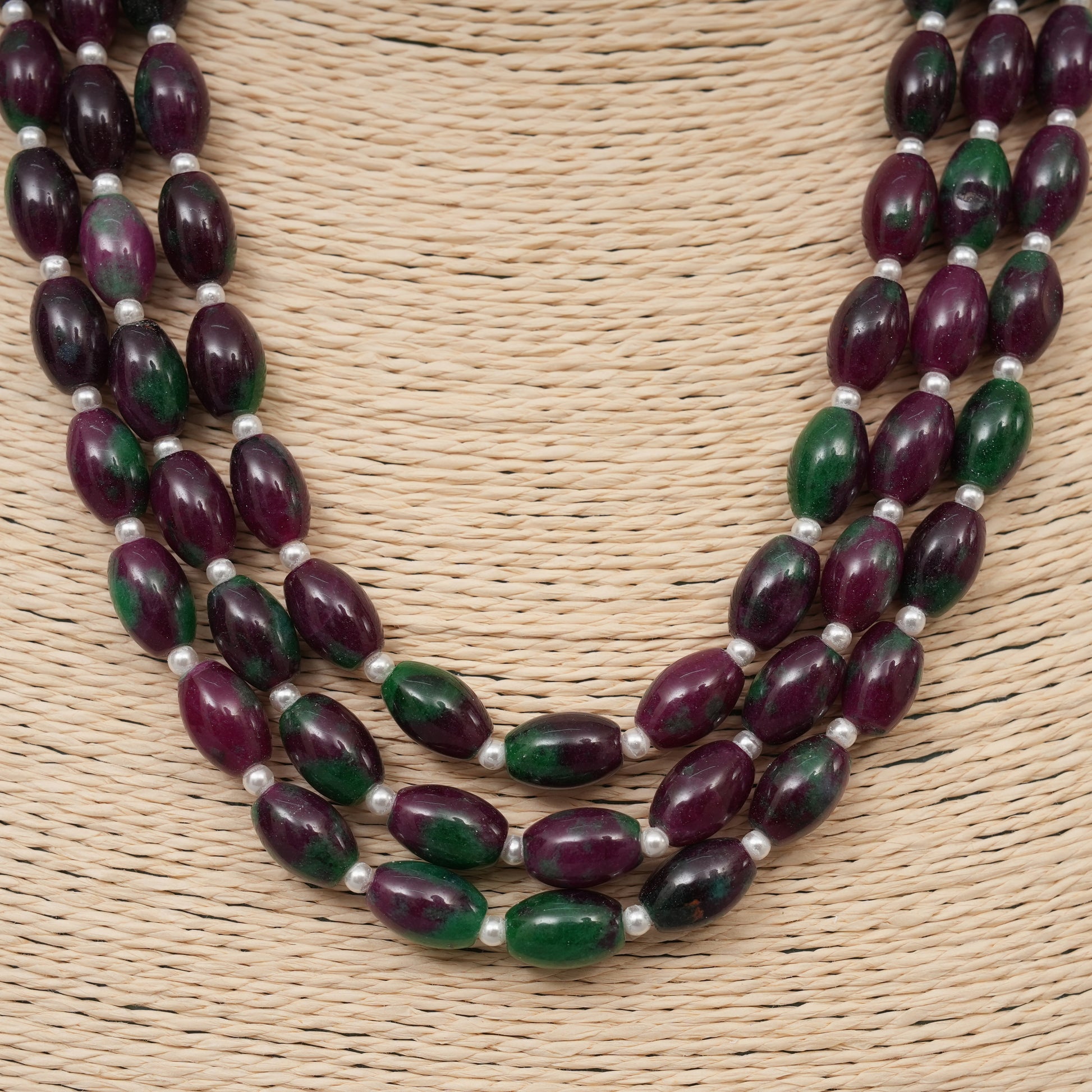 Bold, artistic, and full of character — this Natural Ruby Zoisite Necklace with Pearls features rich 8x12 mm (approx.) oval-shaped beads, intricately paired with elegant pearls to create a vibrant and balanced design. The striking mix of deep green and ruby-red hues of zoisite beautifully contrasts with the soft luster of pearls, making this piece truly unique.