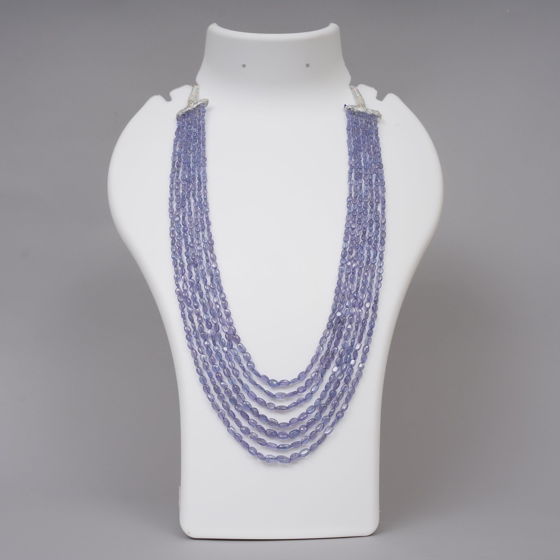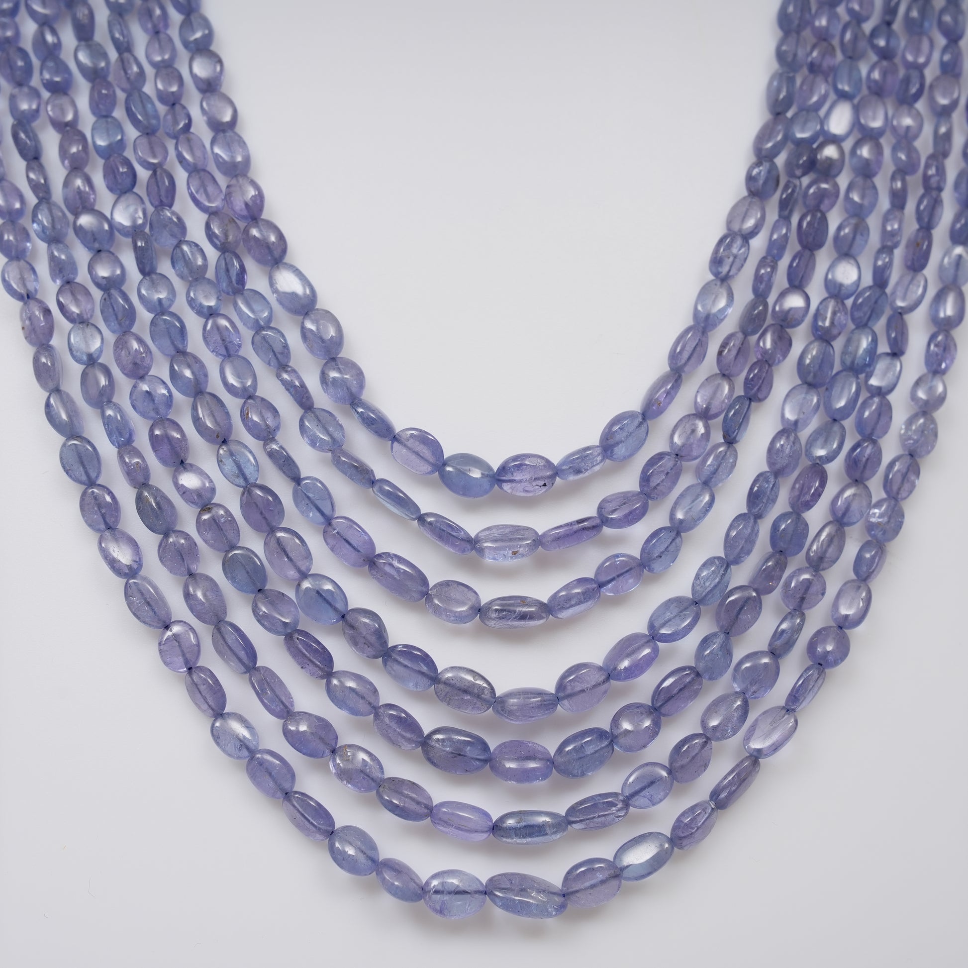 Delicate and enchanting, this multi-strand necklace features natural Tanzanite smooth oval beads with a calming violet-blue hue. Each bead is carefully hand-polished to enhance its natural luster and graceful transparency, offering a refined and elegant look.