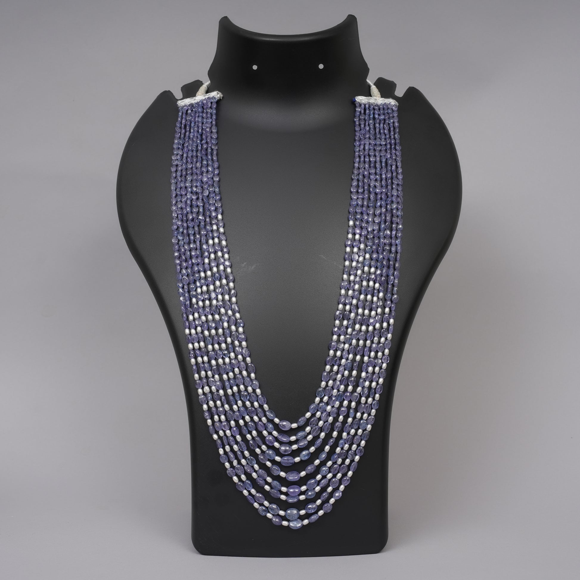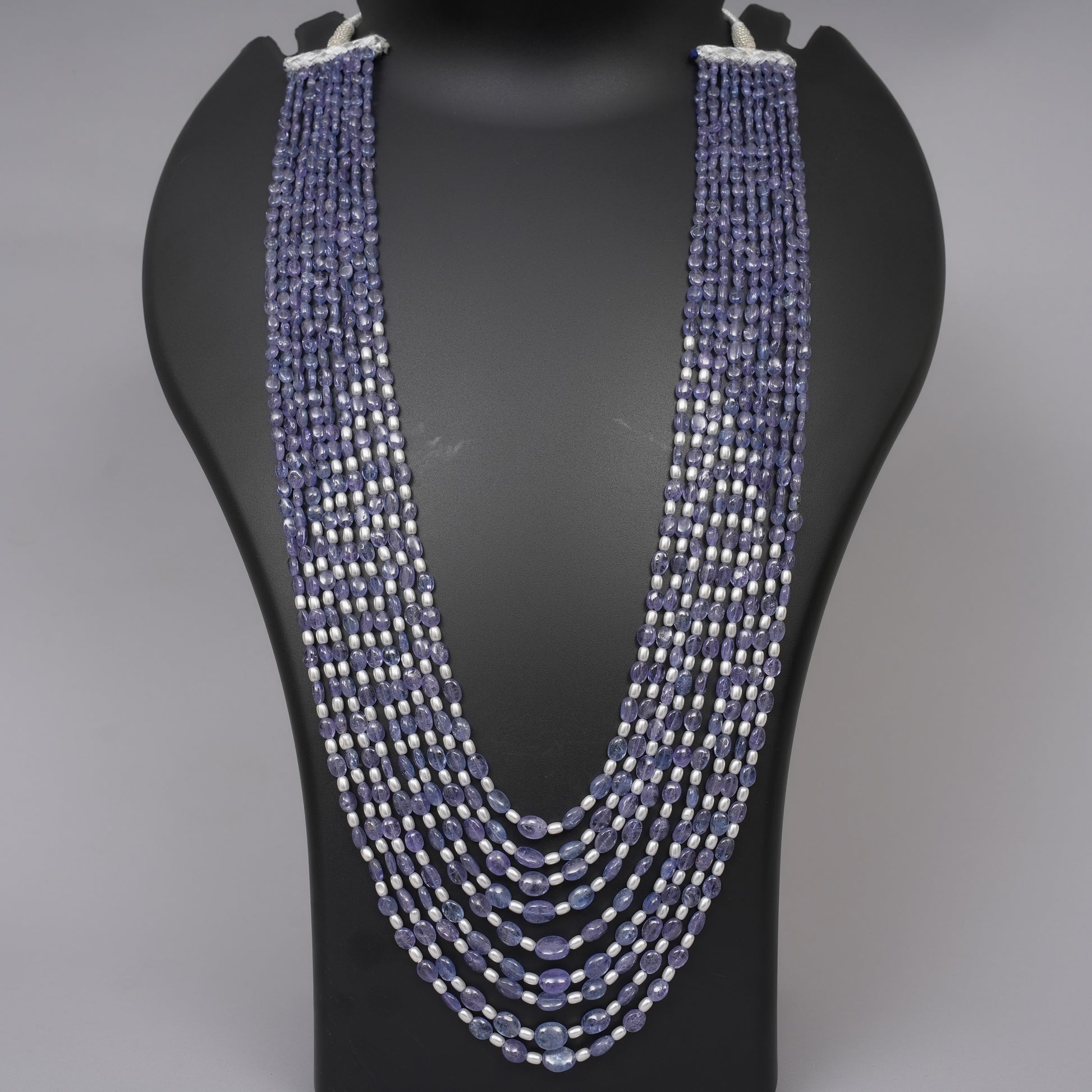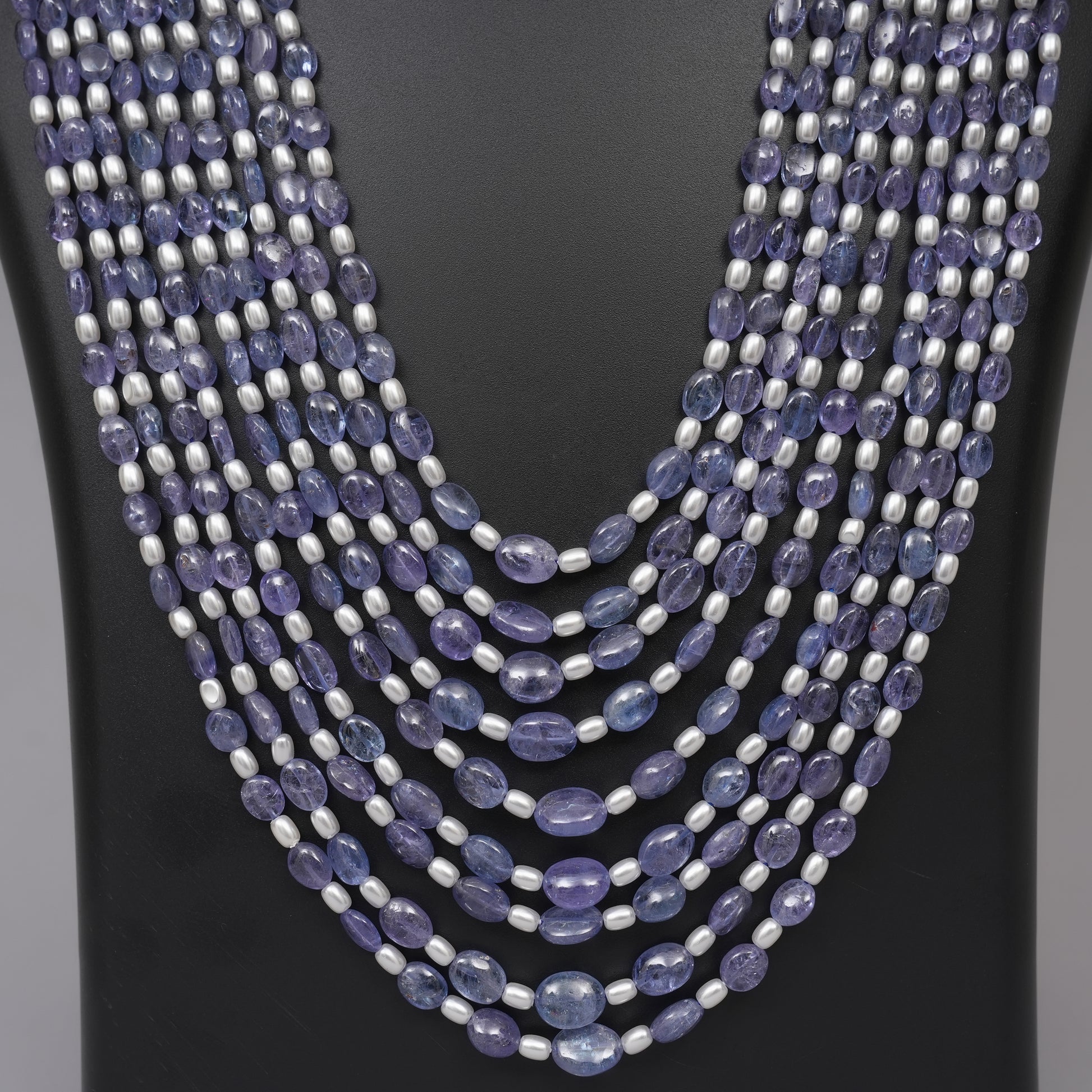 Graceful and luminous, this 9-strand necklace features elegant Natural Tanzanite smooth oval beads paired with delicate pearls, creating a harmonious blend of soft blues and creamy whites. The beads range from 5x7 to 6x8 mm (approx.), offering a refined look and a smooth feel.