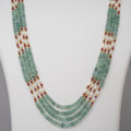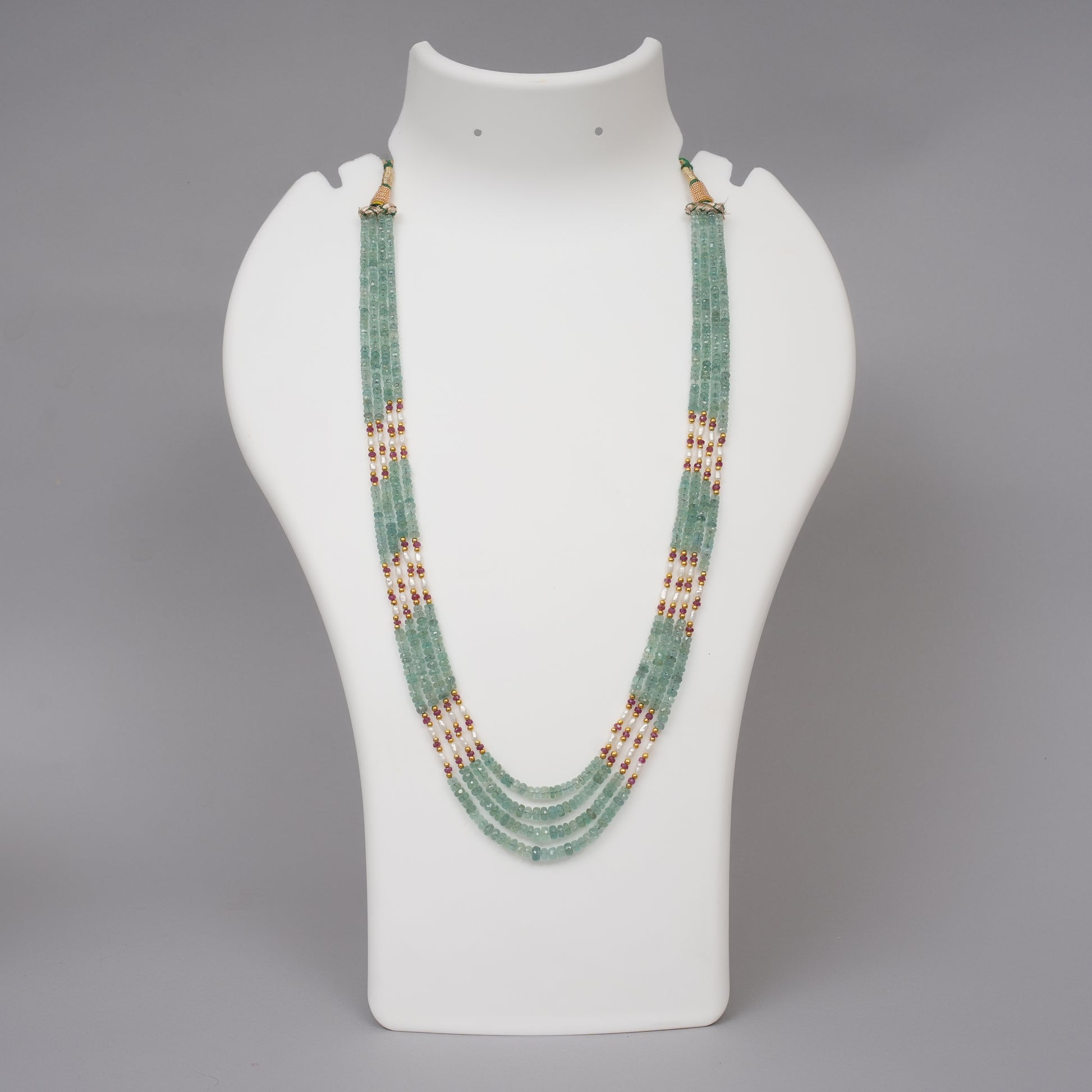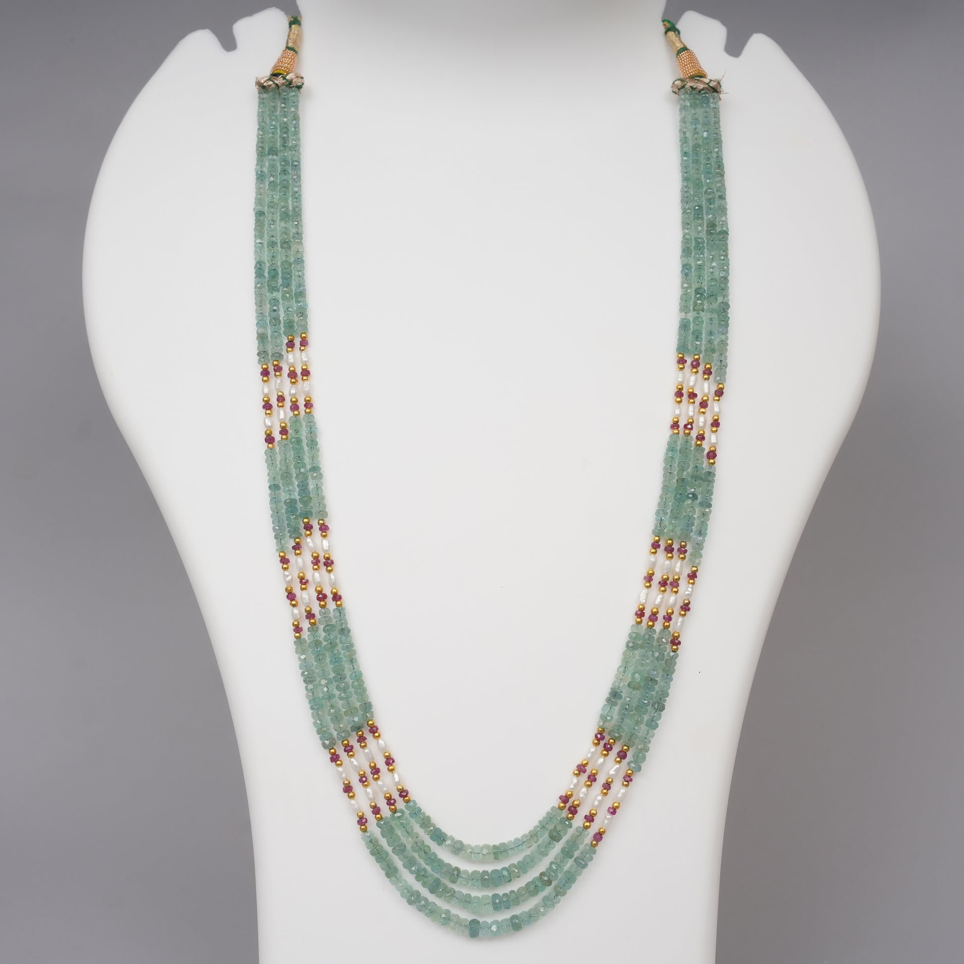 Graceful and vibrant, this 4-strand necklace combines the lush green brilliance of Zambian Emerald faceted beads, the deep red of Ruby beads, and the soft glow of Rice Pearls. With bead sizes around 3–5 mm (approx.), this 22-inch necklace is a harmonious blend of color, culture, and craftsmanship.